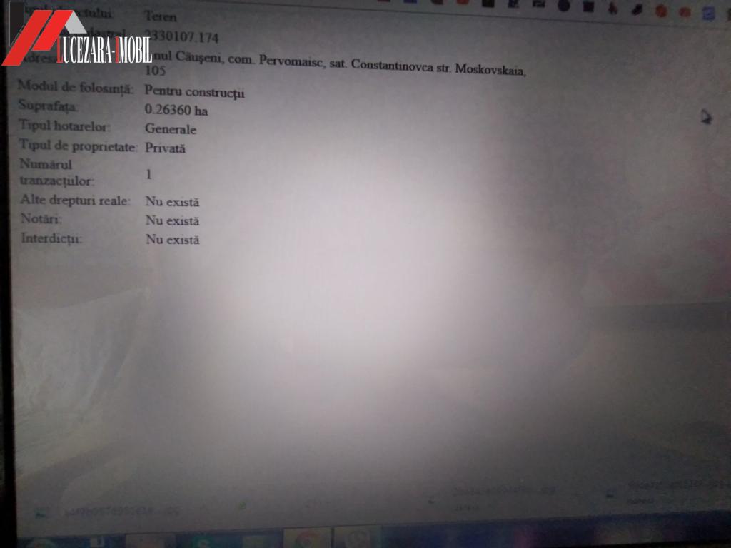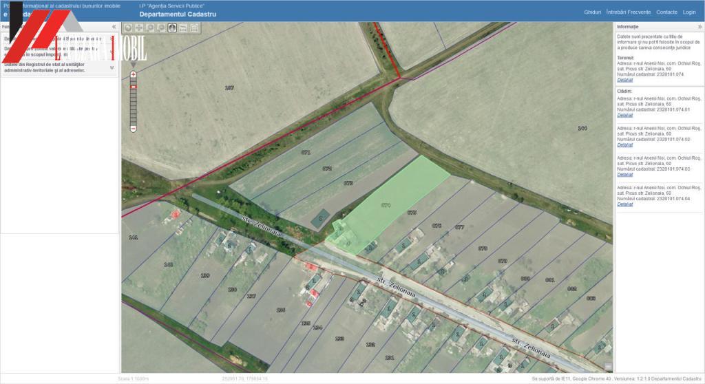 Tipul obiectului: Teren Numărul cadastral: 2328101.074 Adresa: r-nul Anenii Noi, com. Ochiul Roş, sat. Picus Modul de folosință: Pentru construcţii Suprafața: 0.39870 ha Tipul hotarelor: Generale Tipul de proprietate: Privată Numărul tranzacțiilor: 0 Alte drepturi reale: Nu există Notări: Nu există Interdicții: Nu există